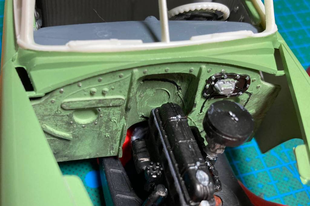 I some work on the car model. I did a little detailing on the firewall, painting in the wiper motor, some wires, and some bolt heads, and then I dirtied it up.