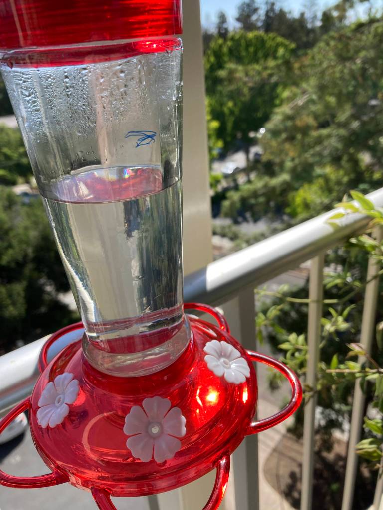 Afterward I checked the hummingbird feeder. My feeder has been discovered by several birds who are cooperating quite nicely to drain it. Observe the blue mark: that was the level as of yesterday morning.