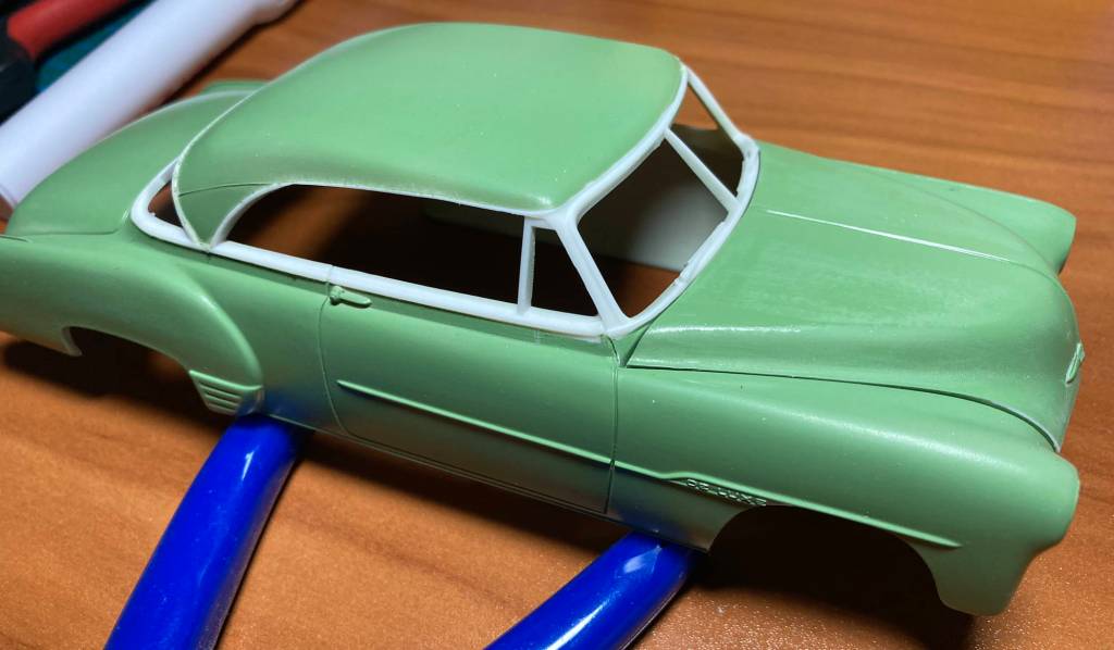 So next step will be to spray a light color coat. When that is dry and hard, spray the gloss clear coat. However, that means masking again. You can see where I masked the parts around the windows that will be chrome. I did that with green masking tape, and did it pretty well. You can see one place just under the passenger side vent window where the tape was too far down.