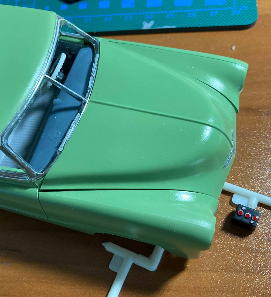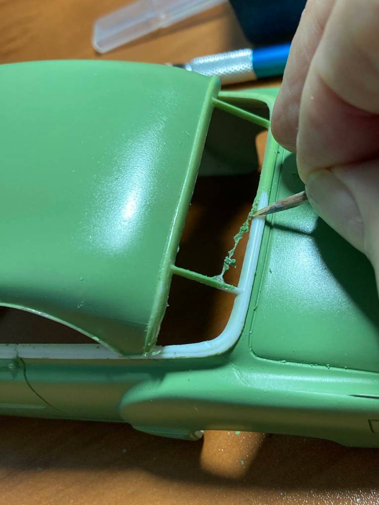 The other car in my life, the model one, got some attention. The clear acrylic came in so I set up for painting. Sprayed the light color coat. Sprayed two coats of clear. I am not at all happy with the paint texture but I don’t know what to do different, and I don’t feel like fussing any longer. I used a toothpick to remove the rubbery “frisket” masking.