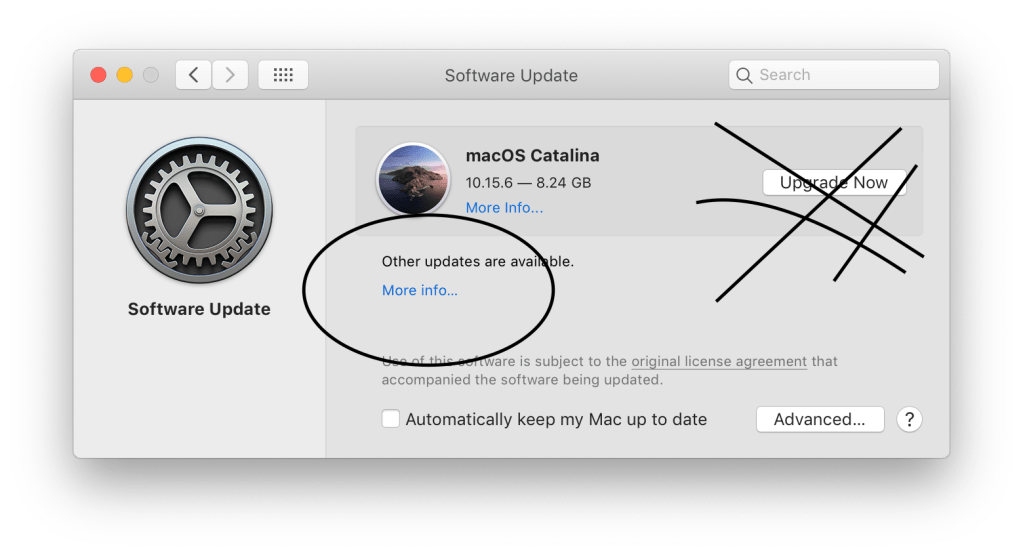 Then wrote a note to the CH bulletin board advising Mac users about the latest update. MacOS keeps suggesting politely but insistently that we should upgrade to Catalina. I don’t want our in-house Mac users (of whom there are many) to attempt that, because if there is any problem, which is possible with an OS version change, they’d be on their own. However, MacOS also offers other updates the same way. So I sent a graphic:
