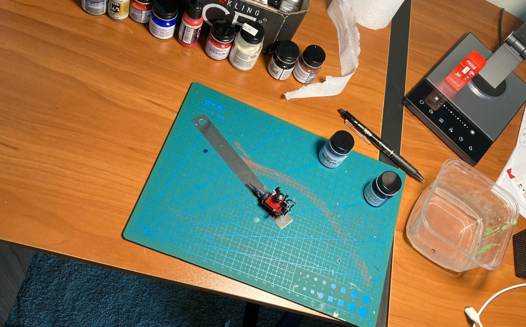 After my run I alternated between reading and working on the model car: paint a bit, read a while to let the paint dry or the cement set, and repeat. Eventually I finished the engine.