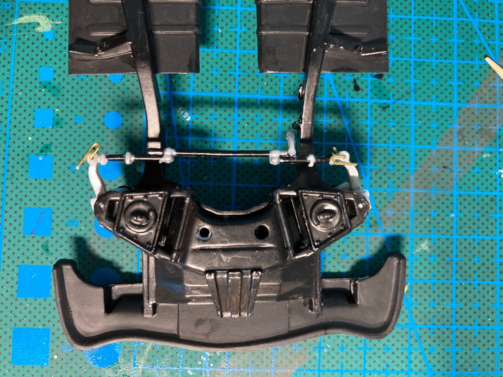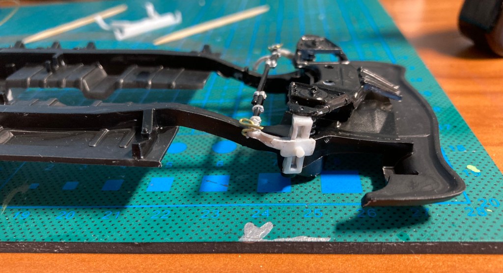 Off and on through the day I worked on the model, where I achieved a bit of a coup. The model has a detailed front end including steering knuckles/kingpins, and a detailed little tie-rod between them. The kingpins are set up so they could pivot, giving steerable front wheels. However, the connection between the tie-rod and the steering knuckles was designed to be cemented solid. A pin on the knuckle went into a hole in the end of the tie-rod, and if you didn’t cement it, the tie-rod would just fall off. So close to articulated steering, but not there. Assembled to instructions, the wheels would be fixed.
