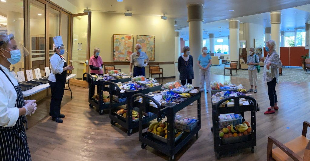 With the kitchen staff shorthanded and being isolated in the kitchen, not allowed to contact residents, the market carts were going to be terminated. Enter my co-coordinator Marcia, who recruited some residents to do the door-to-door schlepping. Today was the first day for this.