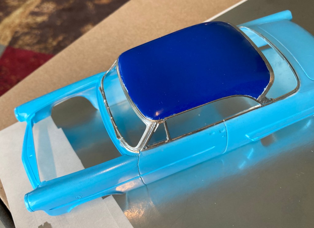I had been looking forward to this for some time. It had to wait until the paint was completely done. The “chrome” is a very thin foil that came in a single sheet (underneath the car in the picture). Remember how in high school you would pop a stick of Wrigley’s and then spend ten minutes carefully peeling the silver foil off the wax paper backing? This is the same stuff. Well, not really. It is “real metal” according to the maker. With a very sharp X-acto knife you cut around a strip of it, lift the incredibly delicate foil off the backing, and place it over a piece of the model. Then you carefully but firmly emboss and burnish it down onto the plastic, using a fingernail or a wooden toothpick. It forms nicely around every detail and with sufficient care you can get it looking pretty much like real chrome. Don’t do it carefully enough and it tears, or the toothpick makes a tiny hole, and you get to scrape that piece off and do it again. Which I did, frequently.