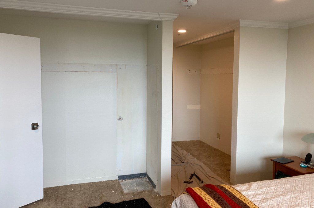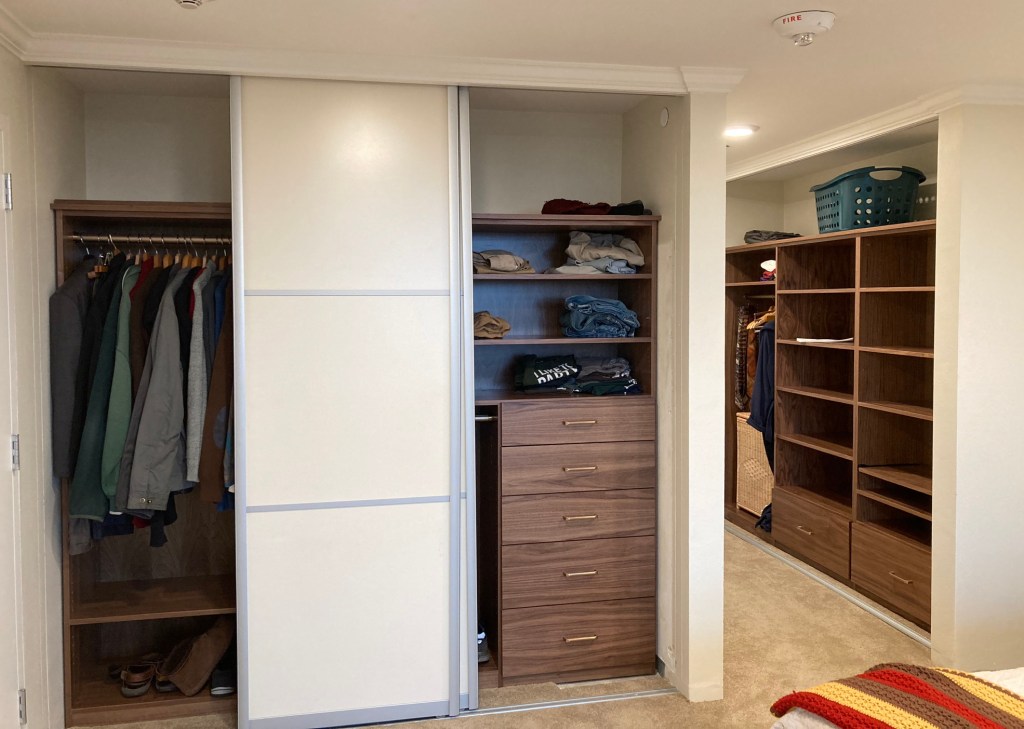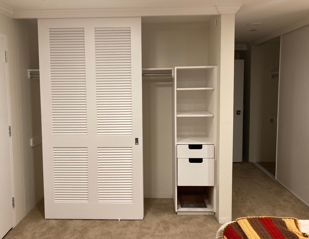 Here’s the deal on the closets. Two big closets in my bedroom, which date from the late 60s when the building went up.