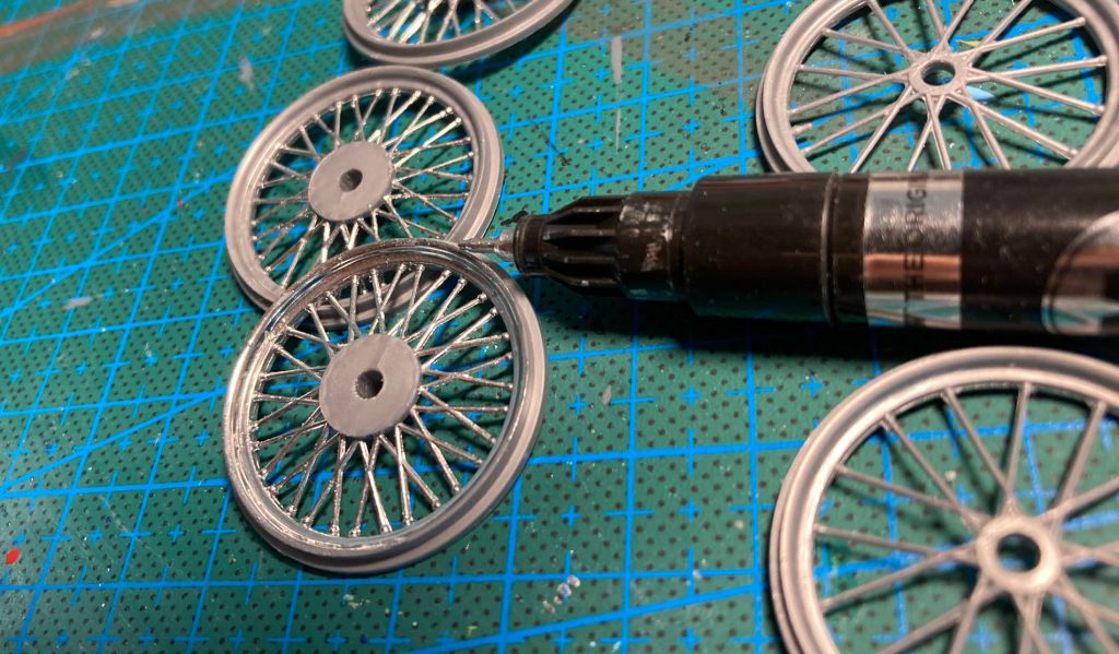 Put in some more work on the MG’s wheels, at which I can only spend limited time. My back starts hurting if I sit on my stool by the desk too long. There are five inside and five outside pieces, and I have to chrome-plate both sides of all ten pieces.