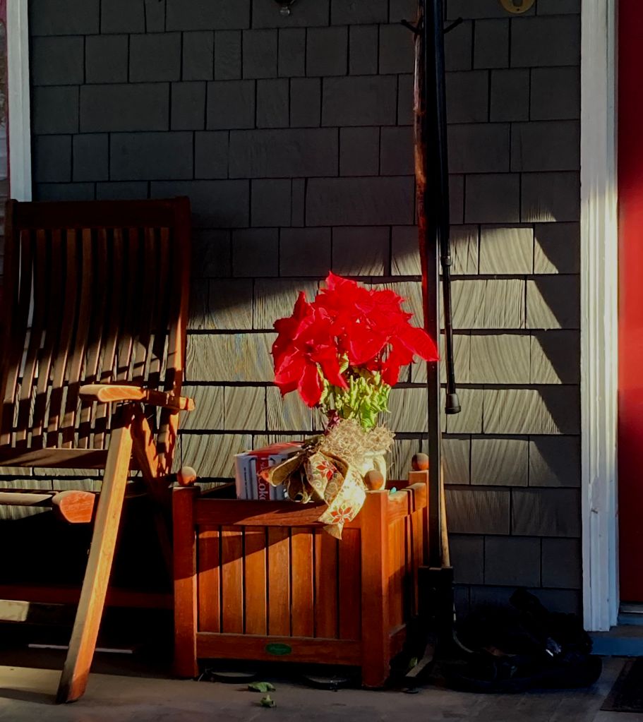 Later I took a short second walk, during which I spotted a nice poinsettia(?) with the sun on it.