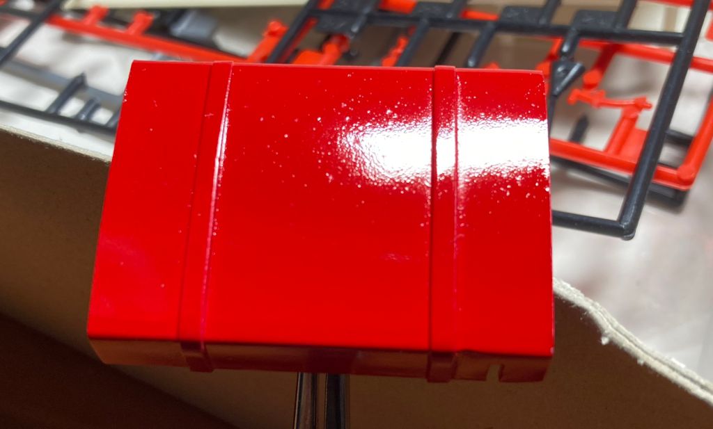 In the afternoon I experimented with clear-coat spray on pieces of the MG with highly unsatisfactory results. Despite all I can do for cleanliness, tiny craters open up in the finish.