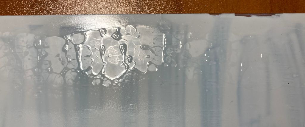 I prepared a piece of plastic primed with a gray primer. When it had dried, I mixed up the new clear paint with just a bit of acrylic thinner to get the texture right and tried spraying it, and was shocked at what happened in the areas where it was thick.