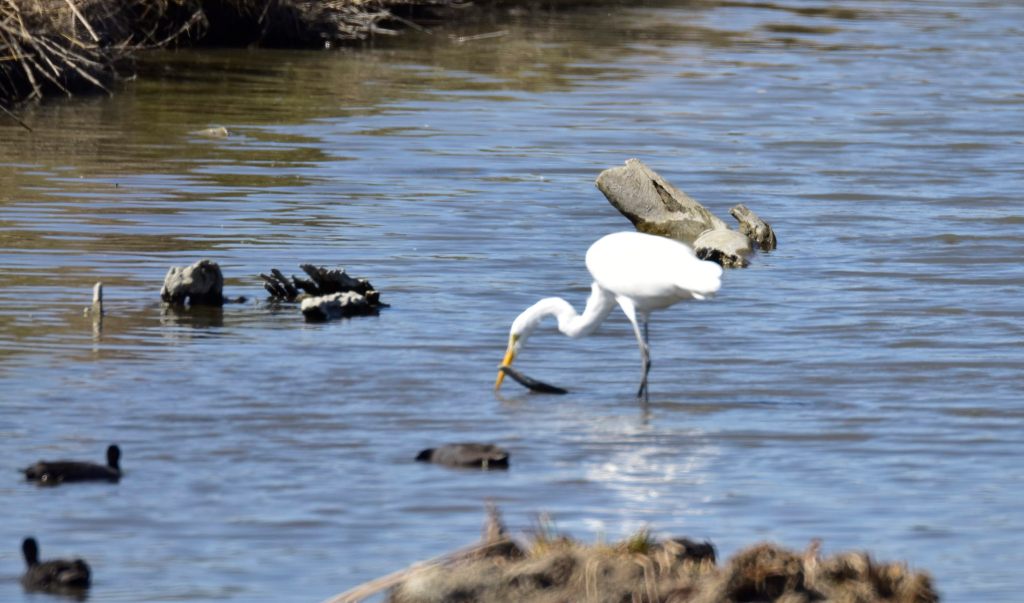 Wrong. The water was almost as low as 5 days previous. Hardly any bird action. I shot a few but there is a problem. The 500mm has very shallow depth of field, which is to say the distance at which things are in focus is very specific, and anything closer or further is not sharp. Case in point, this egret, who I caught with an actual fish in its beak.