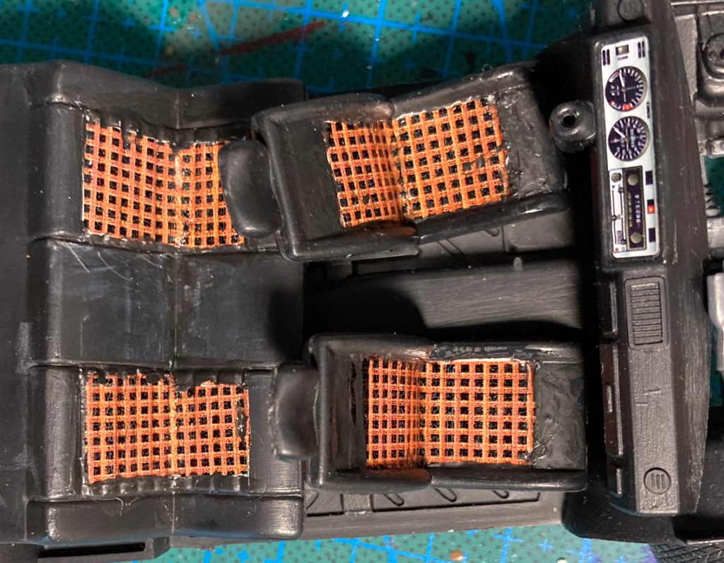 And indeed on that background the orange stripes of the decal looked not bad. Here are the front and back seats with their upholstery, ready to install.