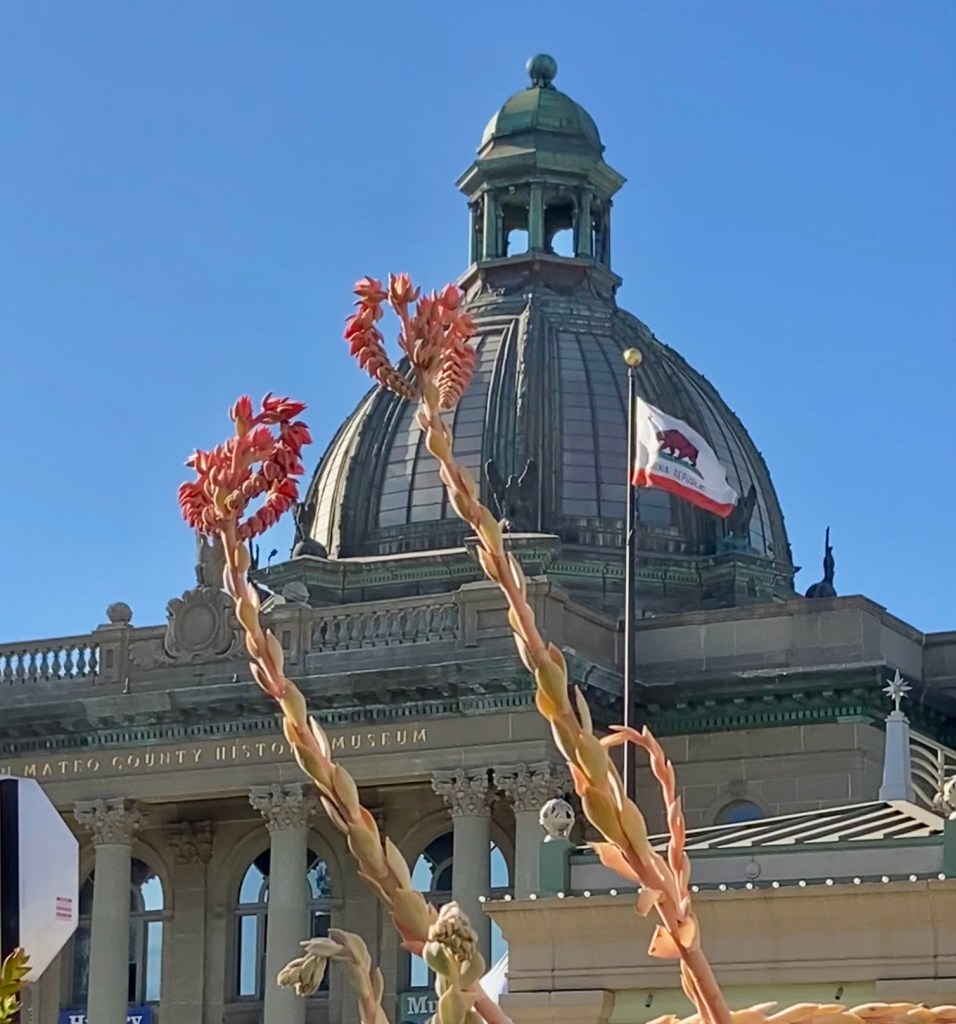 The following is a picture I took yesterday, when I went to the Club Fox, which is on Courthouse Square in Redwood City. I went early and ate supper at a restaurant with outdoor seating, and from my table I was looking up past some succulents in a planter, at the old courthouse (now a museum).