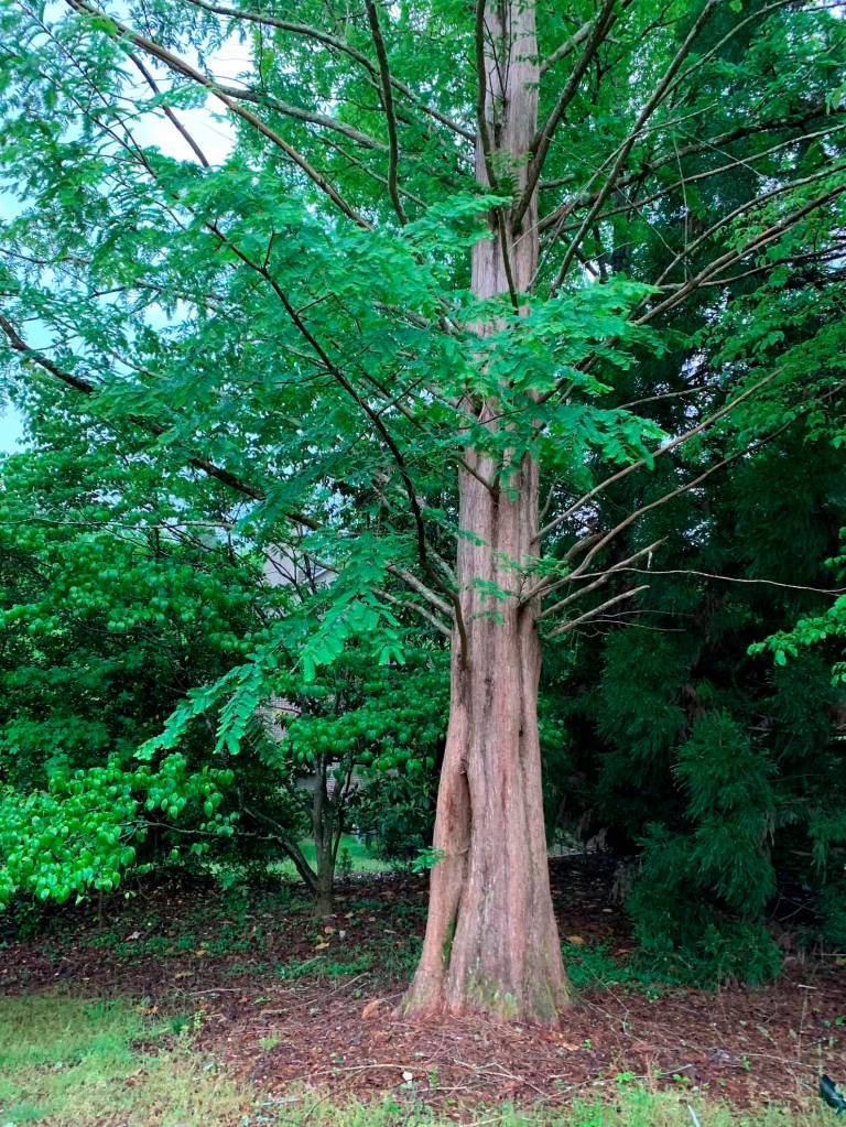 It’s a fairly ordinary frame house on a quiet street. Its strongest feature is an absolute gem of a back yard. This street is at the edge of a developed area, so there are no houses behind, just a small woods of various trees and brush, then a grassy slope. From her backyard you can’t see any other buildings, the plantings are so thick. At the left edge of the property is a large Valley Oak, the kind that likes to lean over. Years ago they had metal pipes installed like crutches to support it, so the trunks — at least 16″ thick — lean over and shade the left half of the yard. In the center is a young Dawn Redwood, a little bit bigger than this one. On the right are some nicely maintained rhododendron. The whole thing is like a little glade in the deep woods.