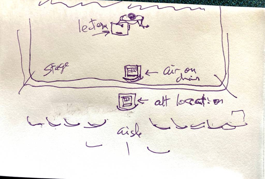 After all the waffling and frustration about how to get an image of the stage into the computer and shared with Zoom, I had finally realized that Zoom will do it for me. I set a Macbook Air on the seat of a chair, and set the chair on the front edge of the stage, with the computer facing the performer, which in this case is just Connie standing by a lectern. The camera is wide enough that it gets the performer from below the knees up, and with room for them to move left and right a few feet if they want.