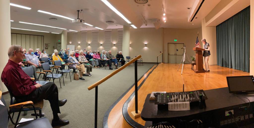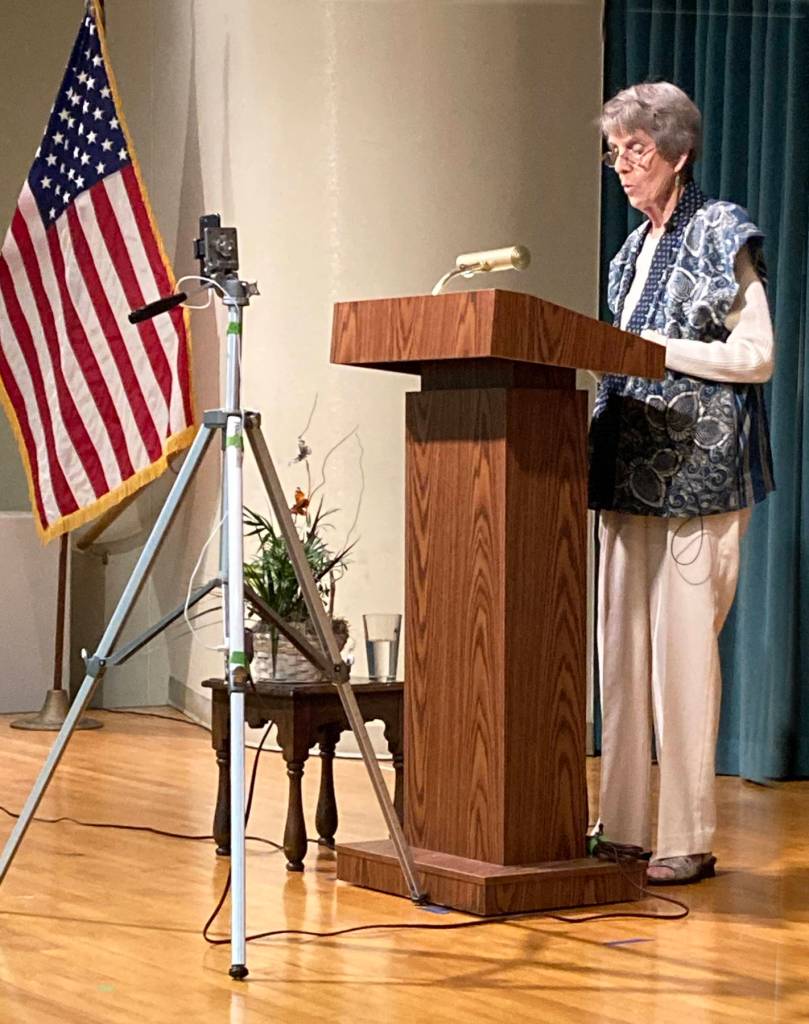 That was about it for the day. To take advantage of the open space, here are a couple of pictures of Connie’s poetry reading on Sunday. I had to take these with Stew’s phone, because my phone was on the stage, logged in to the Zoom session.