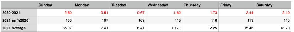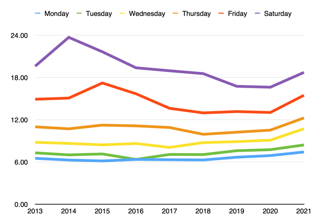 It seems to show that I had trouble with Friday and Saturday back in ’14 and ’15. That aside, just looking at 2018-21, there seems to be a fairly clear trend, a shallow rise.