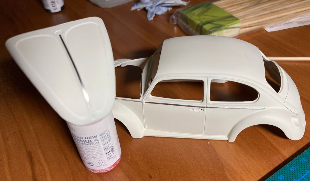 In between meetings I got through a job I was worried about on the model VW. I cut teeny skinny little strips about a millimeter wide — less than a 16th of an inch, more than a 32nd, so probably right around a millimeter which is 1/25 of an inch — from adhesive-backed metal foil, and applied them to simulate skinny little chrome strips.