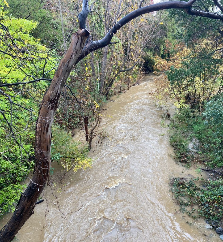 Went for a walk, on damp sidewalks after two days of real rain. Here’s San Francisquito Creek after a lot of rain.