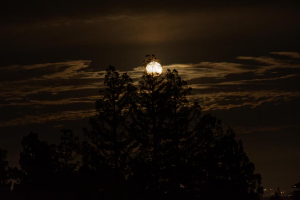 At 6 I picked up my supper tray and just as I was about to sit down, my eye was caught by an orange glow on the eastern horizon. The full moon (well, it was full yesterday), apparently called the Wolf Moon because it is the first of the year, was just rising in some clouds and behind a tree. Oooh I said, picture. Got the camera, put it on the tripod, made a bunch of pixels. Putting two different exposures together gets this.