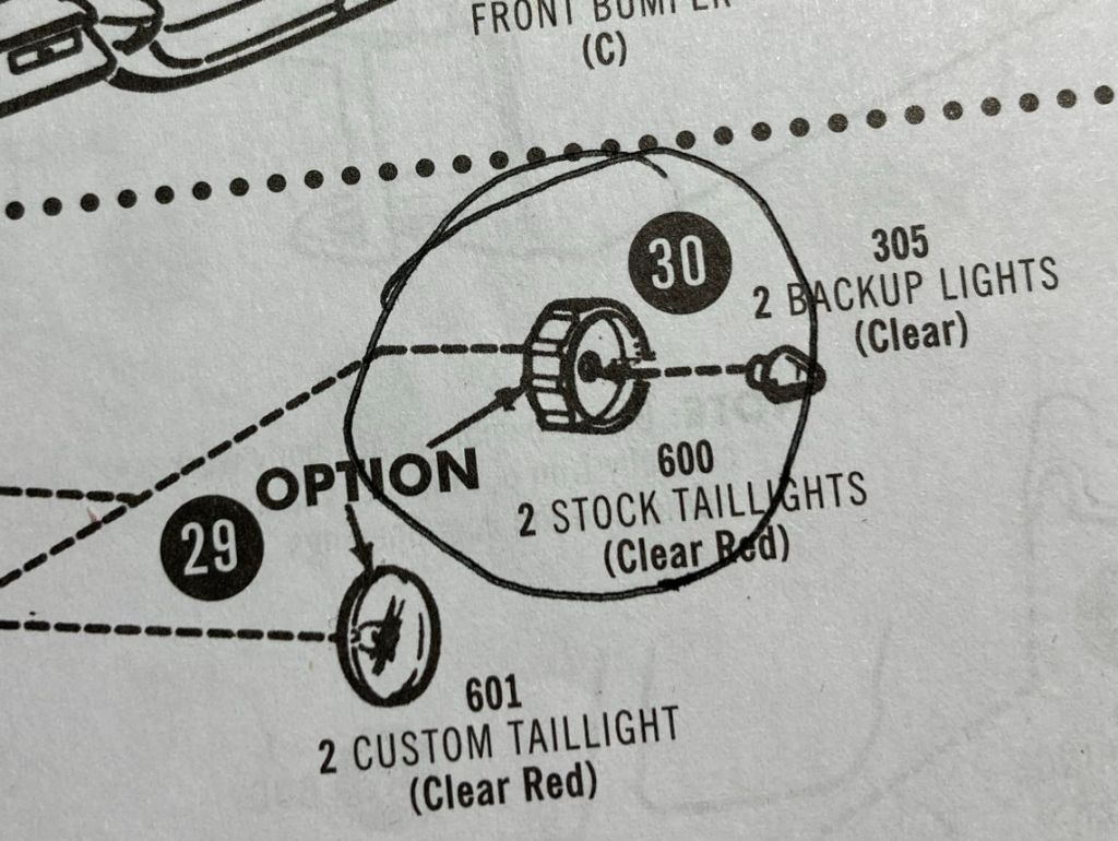 Unfortunately this kit, which is from a reputable kit company, AMT, is not very good. One key part, the windshield trim surround, was broken. One piece, the panel that closes the butt end of the car below the trunk lid, was warped and stained and didn’t want to fit. The gap where it met the tail fins would have to be filled with putty. Most important, the chrome ring that makes the taillights look like rocket jets, was simply not there. It was in the plan but not in the parts provided (and I checked carefully, many times).