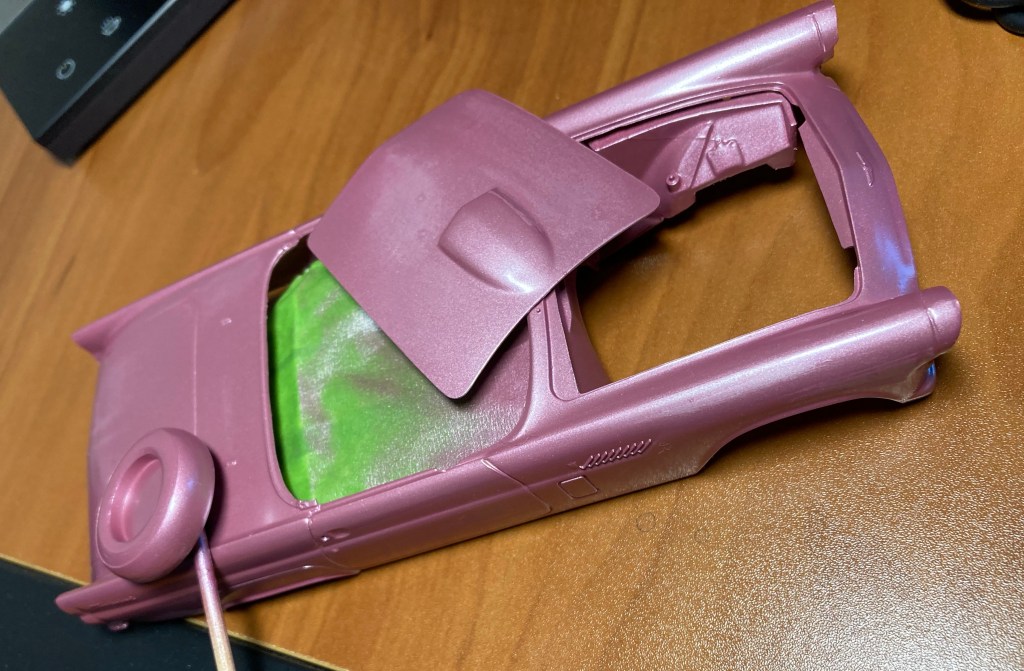 At hourly intervals through the day I was spraying the T-bird model with its pink color. Here it is after 5 light coats. Kind of scuffed because it has now been lightly sanded with 1000-grit. Tomorrow it gets a final couple of coats, then it hardens for a few days. Then it gets chrome and decals, then clear-coat.