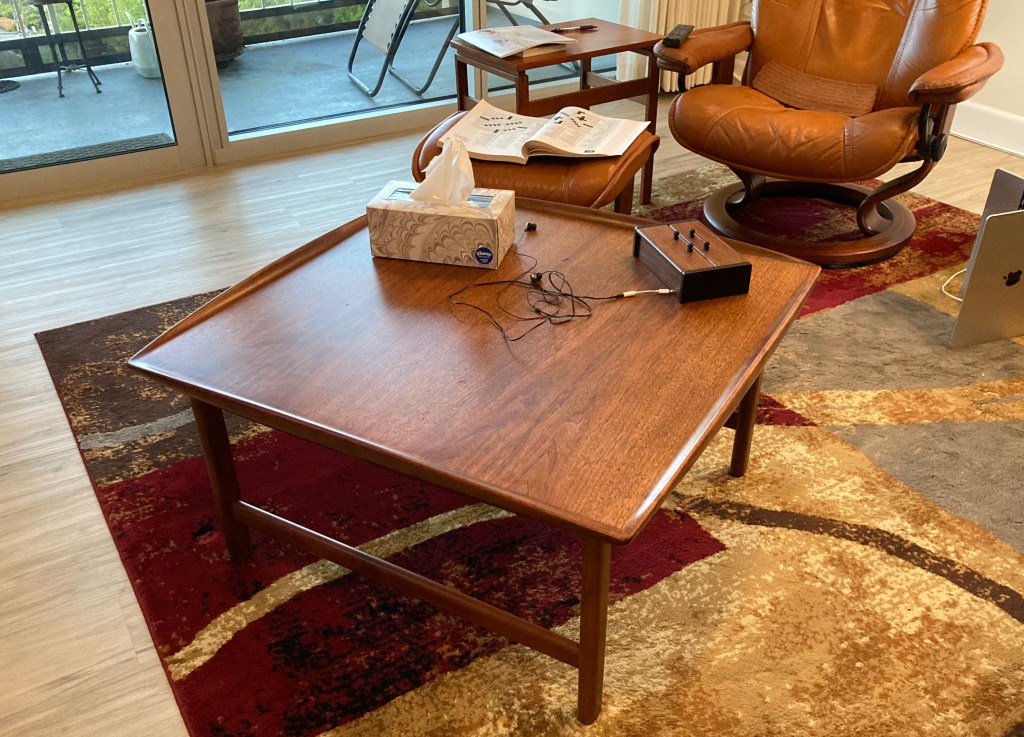 Like oiling the coffee table. You remember my mid-century modern wooden coffee table. Here, let me drop the computer and shoot a picture of it.