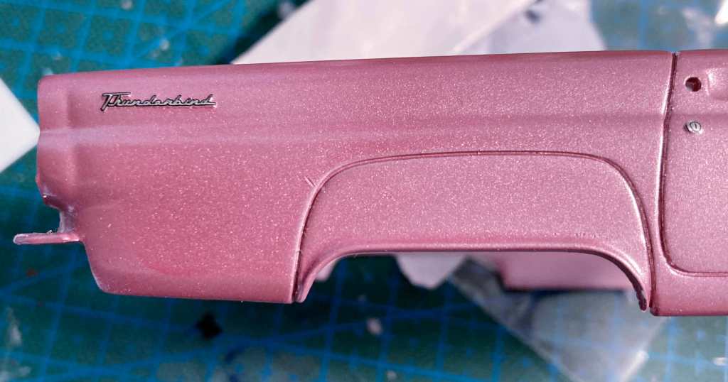 While these things aren’t as shiny as chrome, they fit well. The grid of chrome slashes, no way could I paint that in. Tragedy has struck: during the night, somehow, the little badge decal on the driver’s side has fallen off. At less than a millimeter square and light enough to float, there is no chance of finding it. All these things have to do is stay stuck until I spray with clear varnish, which is almost the next thing to do. Cling, little decals!