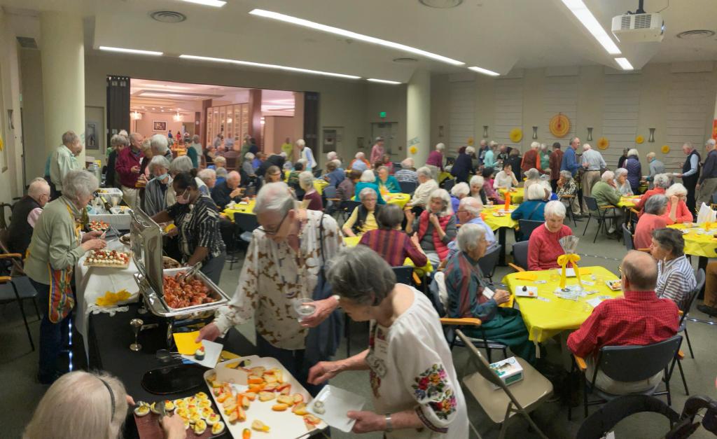 The tables were decorated with fake bills and coins. There was plenty of wine and some really nice snacks from the kitchen (deviled eggs, cheese-stuffed little peppers, shown). There was a sing-along to familiar songs with new lyrics extolling the labors of the staff. Lots of labor and skill went into making it a fun event.