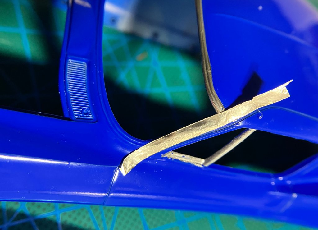 Take deep breath, cut next piece. Note blobby look of vent-window, which is painted chrome.
