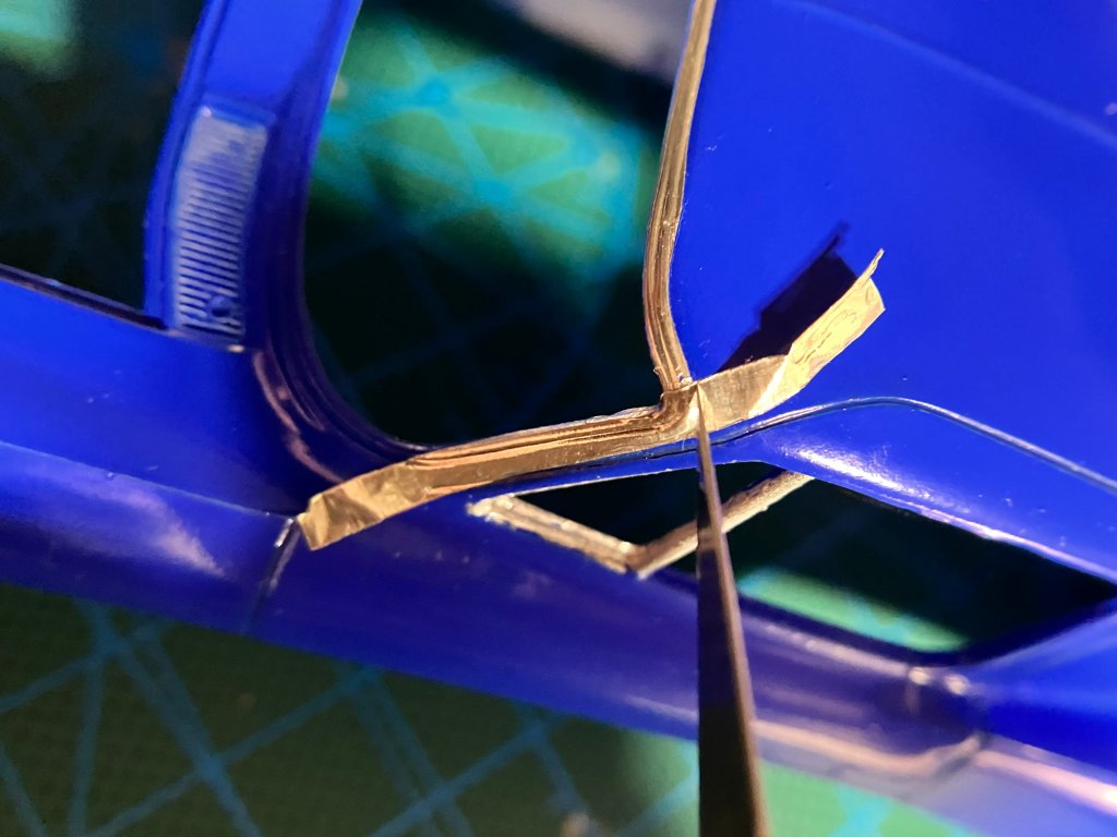 So the other method is metal foil. I’ve tried proper metal foil such as is used by artisans embossing foil into book covers and such. It is incredibly thin and very hard to work with. Although I may give it another go. However the third route is Bare Metal, it’s a heavier foil that is easier to work with. Here’s me putting some Bare Metal around the windshield frame.