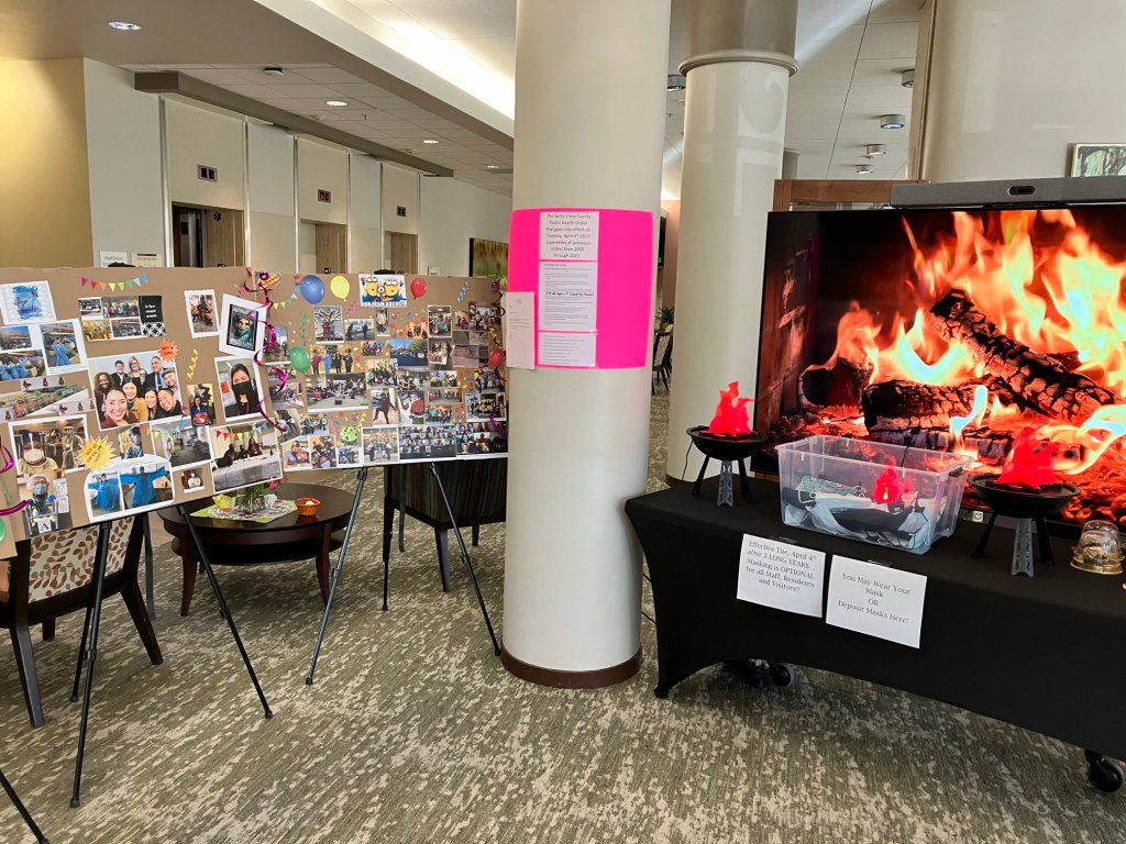 Also early this week the County of Santa Clara announced new Covid rules including a change that meant, for the first time in three years, our staff at Channing House no longer have to wear masks. To celebrate, Rhonda and others set up a very fancy “ceremonial burning of the masks” display in the lobby. They made up poster boards with pictures from the last three years of Covid restrictions. Remember 2020? When everyone was eating in our rooms, and resident volunteers were delivering the meals?