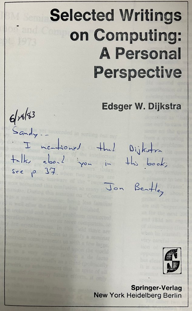 Here’s something I found interesting. Jon Bentley, a famous computer scientist (I used to own a couple books of his), was working at Bell Labs apparently, when Fraser was managing it. And he has made a copy of a couple pages of a book by Dijkstra, another famous computer scientist, because it had a mention of Sandy Fraser. So here’s a personal note from Bently to his boss, in 1983.
