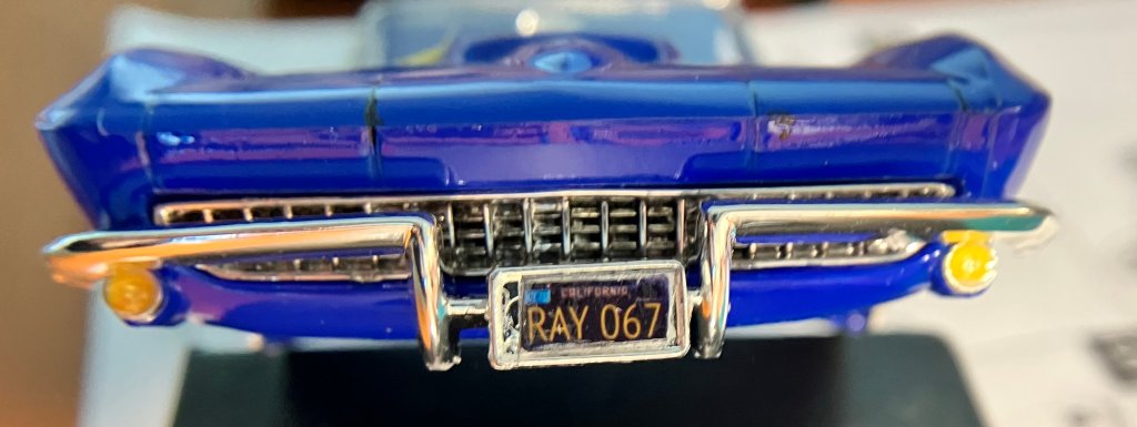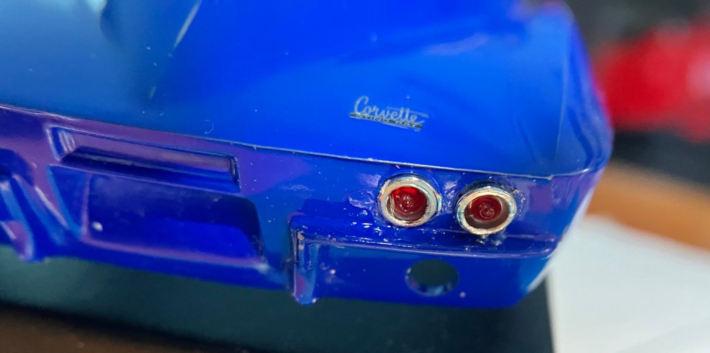 These parts are tiny. The yellow lenses in the parking lights are less than an eighth of an inch across, ditto the little red “bullet” taillight lenses. Naturally I dropped them. Three different times one of the little MFs leaped out of my fingers and of course didn’t stay on the desk. Down on my stomach with a flashlight looking for a weensy little fleck of chrome or red plastic.