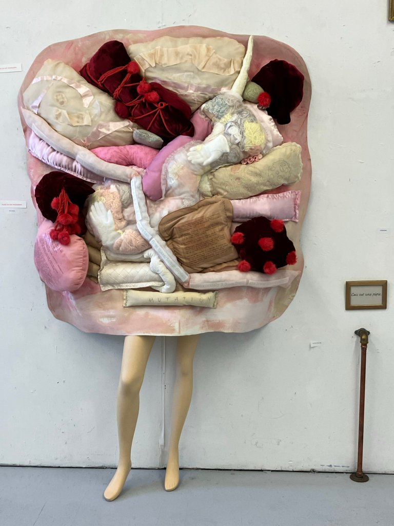 OK, forgive me if you know all about this. Surreal painter René Magritte once painted a realistic picture of a wooden smoking pipe, with the caption “Ceci n’est pas une pipe,” French for “This is not a pipe”. It was a way of warning the viewer to not mistake image for reality. So here in the studio of an artist who clearly favors the surreal style, there is an actual copper plumbing pipe coming out of the wall and going into the floor, and they’ve labeled it “This is a pipe” as a reply to Magritte.