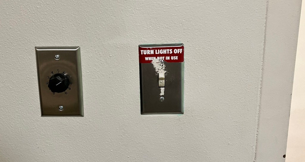 So yesterday after the meeting I realized, it has been years since the Green Room — a little room off a hallway behind the stage — has actually been used as for performer prep. I wonder if the monitor in there works to show a view of the stage, and the sound works. Because if they are waiting for a cue, they need to hear a cue. So I went down and tested it. The monitor works fine, shows a camera view of the stage. But there was no sound.