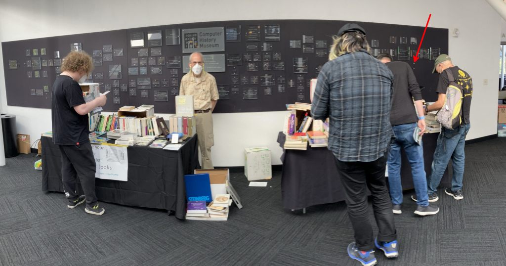 Up and out at 8, picked up Frank at 8:25, over to CHM. Moved our 12 boxes of books out and arrayed them on our table. There was barely room for everything. Here’s the table with Frank and a few shoppers.