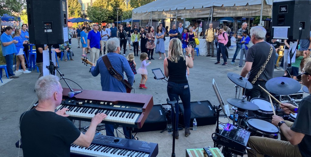 At 5 I took off again for the Third Thursday open-air concerts along California Avenue. The City sponsors seven local bands of various styles, spaced out along the quarter-mile street. I started with Past Curfew, rock of the 60s-70s-80s.