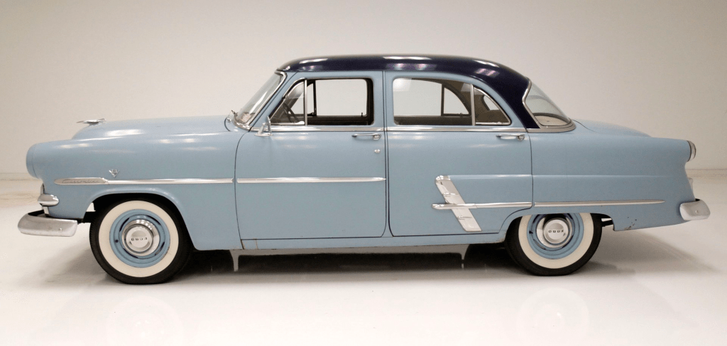 Scott reminds me that the ’56 Fords did not have the flathead V8. Since I am positive my car had one, that means, it wasn’t a 56! Checking online, the last model year for the flathead V8 was 1953. Looking at images online I find a 1953 4-door sedan with the blue-on-blue paint job that I remember. This looks right.