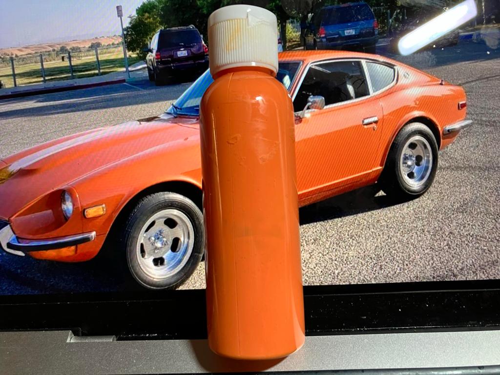 I put all the orange in a bottle and threw in a couple of screws I had in my junk drawer, to facilitate mixing. Measured the weight of the paint in the bottle (by weighing an empty bottle then the full one), and began dispensing single CCs of red and shaking, shaking. Pretty soon had the right color. Here it is, posed against the same reference pic as yesterday.