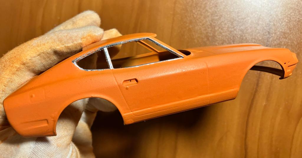 Spent an hour on an initial attempt to apply chrome trim to the 240Z. This is going to be frustrating. The orange paint is finished (multiple coats) and has had a day to harden. Now I want to put “chrome” on these incredibly narrow little bands that represent the drip rail and the window frames. There are three ways to do this. Today I experimented with using metal leaf. This is incredibly thin aluminum(?) foil. Think back to when you would pop a stick of Juicy Fruit and then sit there peeling the foil off the wrapper? Like that foil but much, much thinner. You paint on an adhesive liquid where you want to foil, wait for it to set, then carefully without breathing bring a piece of foil over and using a brush, lay it down and press it home.