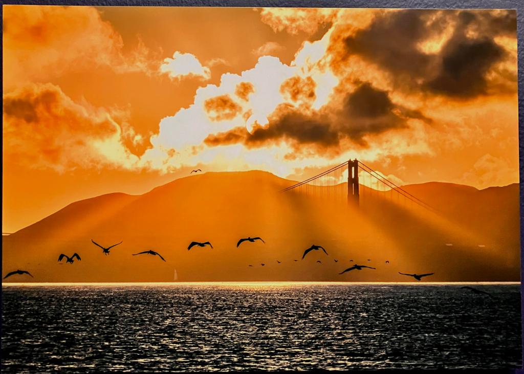 According to the notes in the program, the photographer was planning to shoot something in the opposite direction, when he turned around to look toward the bridge and the Marin hills and saw this sun effect, and the pelicans just happened to fly by. A once in a lifetime shot.