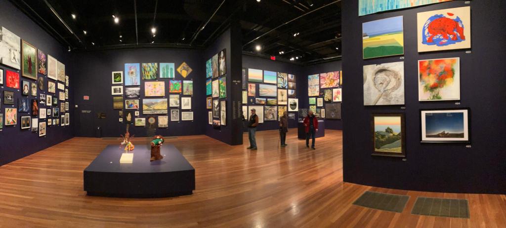 Right big toe got sore in the night, onset of typical gout. At 8:50 I went down and checked and the zoom rooms were still inop. Gerald of IT wasn’t in yet, so I wrote him an email while waiting for the bus to load. That would be the bus to the De Young museum to see the De Young Open exhibit, where the museum invites every artist in the 9 Bay Area counties to submit a work. They ended up hanging over 800 pieces around 4 big rooms. Here’s about 1/4 of it,