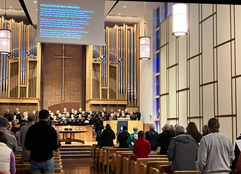At 5 I had a hasty supper and at 5:30 I drove over to the Congregational Church, where I met with #1 AV volunteer David M, to watch him run the Good Friday service. This was in order to see their setup and how they did pretty much what we do here, support events in the auditorium with a second, Zoom, audience. But their equipment is much nicer. Here’s a pic or two.