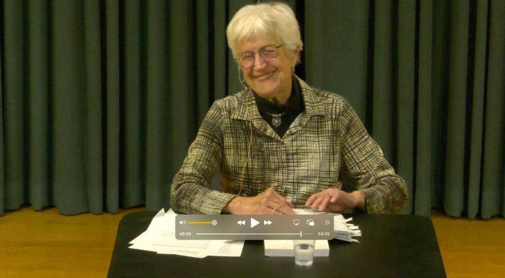 This morning at 9 I opened up the auditorium and set up for Susan H’s book talk. She read from her memoire, Memories of a Mid-Century Girlhood. This was a wonderfully simple event, she sat behind a table on stage and read from her book. Period. No powerpoints, no zoom, just one microphone. Here’s a frame from the video, which I was editing this evening.