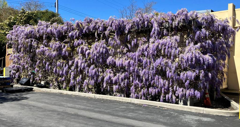 After that I went down to FOPAL and did two hours of computer book pricing and organizing. I picked up a pound of coffee and a loaf of bread and came on back. I paused to take a picture of this wall of wisteria on the end of the market.