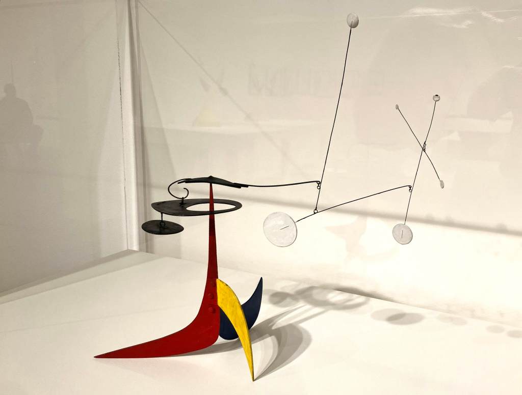 Today about 2pm I got antsy and took the car down to San Jose to the art museum there. Actually there was some kind of mexican/native american festival on the plaza so I wandered around that too. But the main thing was, they had opened an exhibit of small objects by Alexander Calder, that I wanted to see. Calder made lots of jewelry and trinkets out of twisted wire, for instance. But the star of the show for me was this exquisite little mobile, about 18″ high and wide.