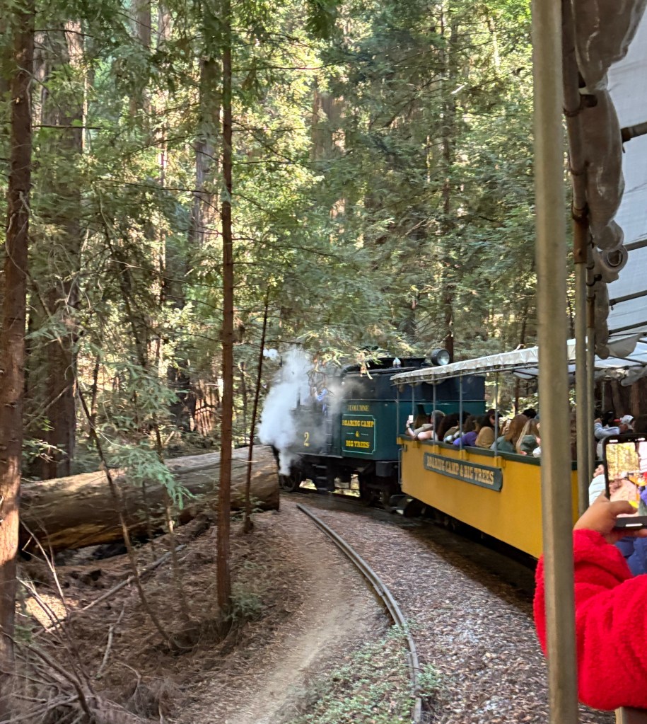 Today was an all-day outing to Henry Cowell Redwoods State Park — near Santa Cruz — also home to the Roaring Camp steam railroad. A record 40+ people had signed up so we had a big and very comfy bus. Took the steam train ride,