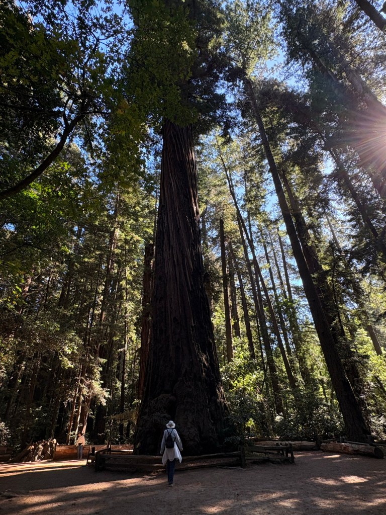 and afterward, walked the loop trail through the big trees. Here’s neighbor Martha for scale in front of the largest tree in the park.