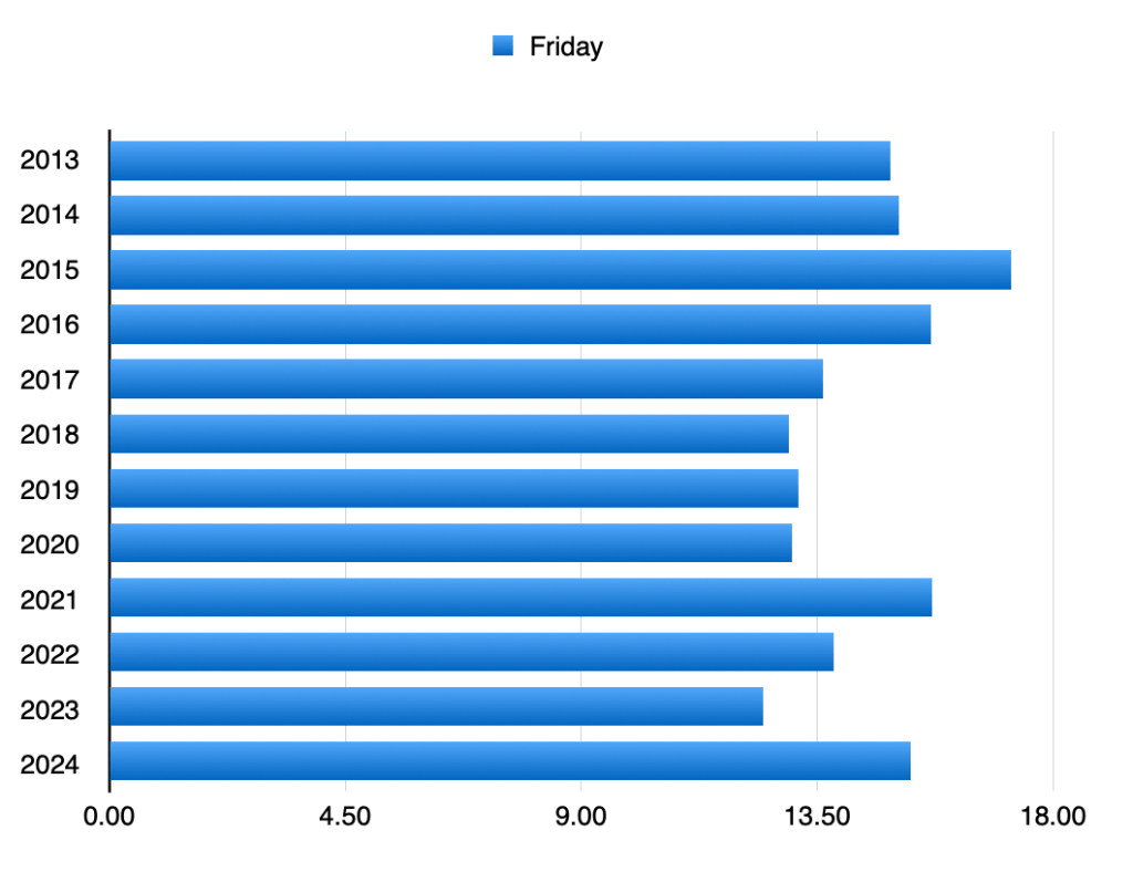 Started the day by creating a new sheet in my file of crossword puzzle solving times, and updating the graphs to reflect 2024’s averages. I keep these numbers because I can, and because I expect that if I experience cognitive decline I might get an early indication here. But there’s no clear signal as yet. For example here are the average solving times for Friday puzzles, the most challenging that I normally finish. (Saturday is much harder, full of puns and riddles, and I fail to finish Saturday about 1 in 8 times.)